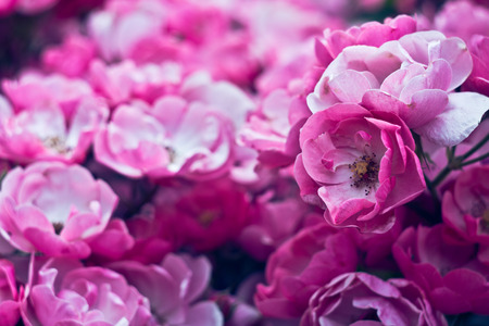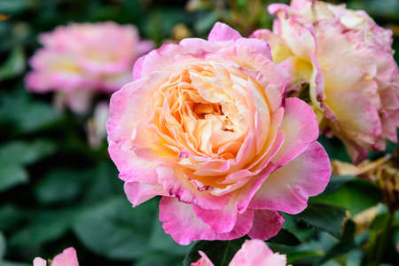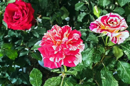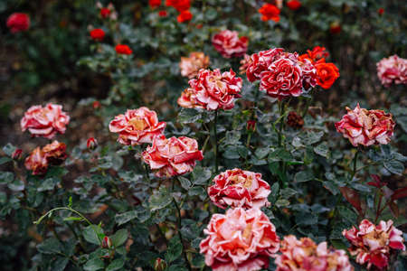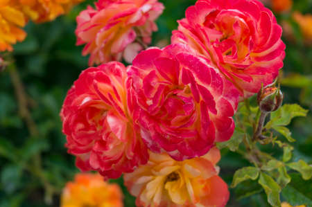 Colorful and vivid ornamental rose flowers in bloom. Nature background