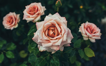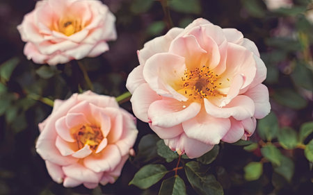 Beautiful light pink fragrant rose flowers bloomed on a bush with dark leaves. Plants and romance. The beauty of nature.