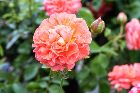 Coral roses bloom in the garden. Mock up for design of cards, congratulations, logos. Copy space.