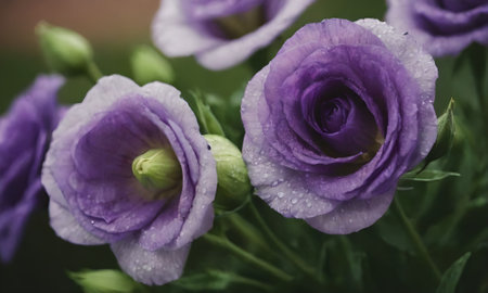 purple eustoma flowers with water drops, close-up
