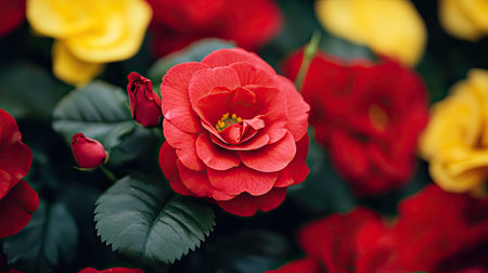 A stunning display of vibrant red and yellow roses, beautifully arranged among lush green foliage. Ideal for nature and floral-themed projects.