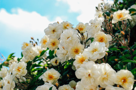 A yellow bush of a climbing rose on a background of a blue sky, a rose background