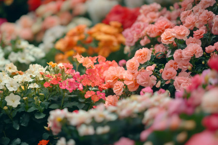 Close up of a layered flowerbed with harmonious mix of white, pink, orange and red flowers, creating a vibrant and colorful display