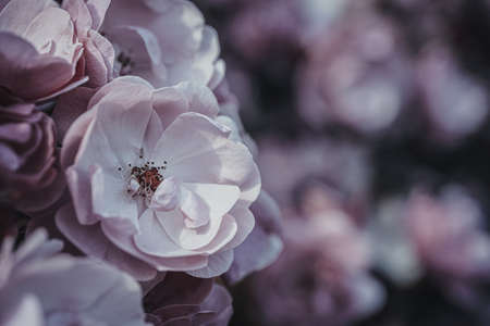 A bush of white roses in summer sunset backlight. selective focus macro shot with shallow DOF.