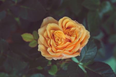 Beautiful pink rose blooming in the garden, retro toned