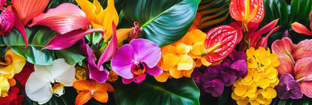 A stunning arrangement of tropical flowers showcases a blend of orchids, birds of paradise, and anthuriums in bright colors.
