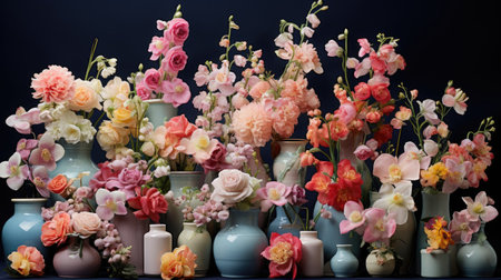 Colorful artificial flowers in vases on a dark blue background.