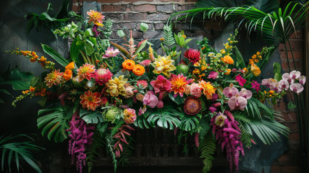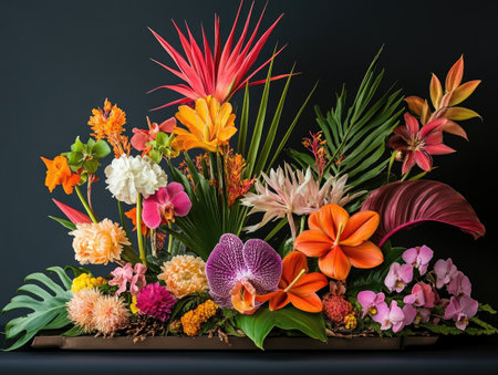 A bold arrangement showcases a variety of tropical flowers in vibrant colors, bringing a lively atmosphere to the garden.