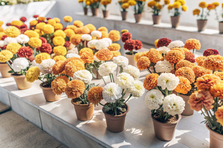 Variety of colorful chrysanthemums in flowerpots.