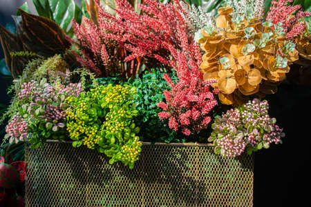 A variety of artificial fake flowers background, many bright colors, blooming, beautifully decorated, sold in one of the stores in the Thai rural market.
