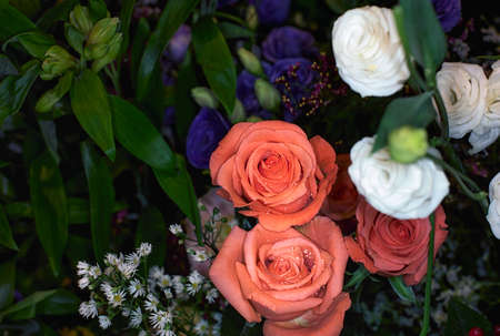 Beautiful bouquet of roses, gypsophila and other different flowers on dark background