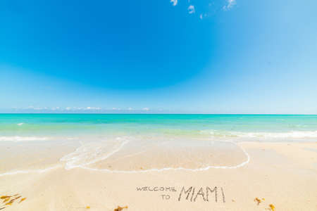 Welcome to Miami written on world famous Miami Beach shore. Southern Florida, USA