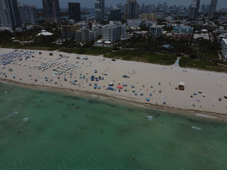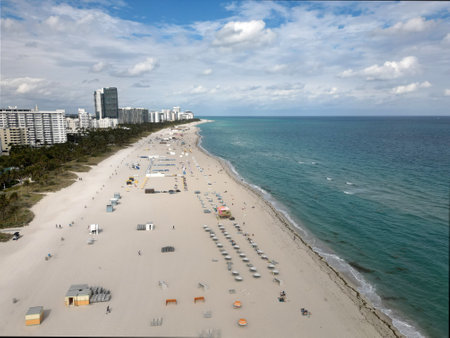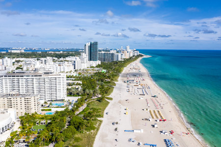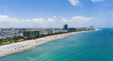 Miami beach with turquoise waters. Aerial view of sandy coastline and waves. Tropical Miami Beach scene with sandy beach. Oceanfront of South Miami. Panoramic of Miami Beach.