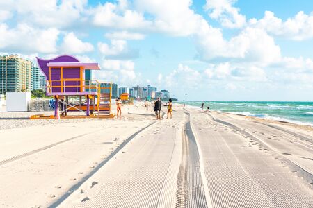 Miami - September 11, 2019: South beach in Miami with lifeguard hut in Art deco style