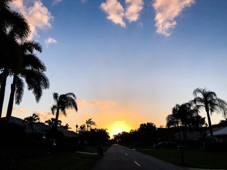 quiet street at sunset in suburban neighborhood