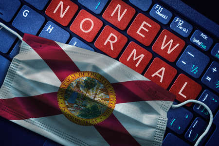 COVID-19 coronavirus new normal concept in the US state of Florida as shown by Florida flag on face mask with New Normal on laptop red alert keyboard buttons.