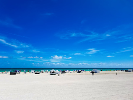 Beach in South Beach, Florida, a city near Miami, with white sand and blue sky, on a suuny day.