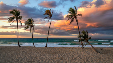 A serene tropical beach at sunset with palm trees standing tall along the shore, waves gently crashing against the sand, and a vibrant sky filled with clouds.