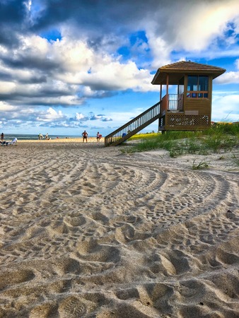 Miami beach. Miami South Beach day time with lifeguard tower and coastline with colorful cloud and blue sky.