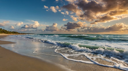Golden beach grass swaying in the gentle breeze with turquoise ocean waves rolling onto a sandy beach and white clouds dotting the sky. Ai generated image
