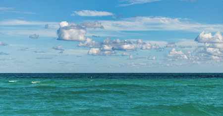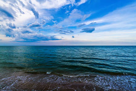 Ocean skyline with blue sky and white cloudy, natural landscape background