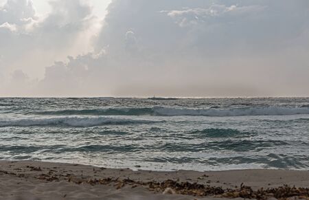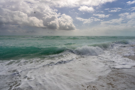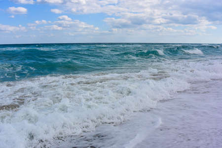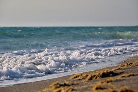 Ocean waves and sand on sky. Stormy sea waves. Summer sea beach wave. Foamy ocean waves. Summer ocean breeze. Dreamy summer beach background. Ocean splash waves.