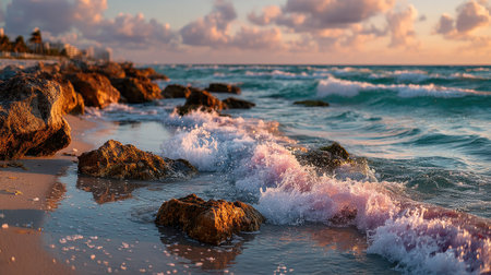 Serene scene of ocean waves gently crashing onto the shore at dawn. the sun rises behind fluffy clouds, casting a soft golden glow on the water. perfect for coastal-themed designs, relaxation, meditation, and nature-inspired visuals. Generative AI