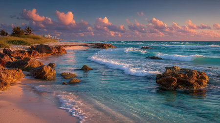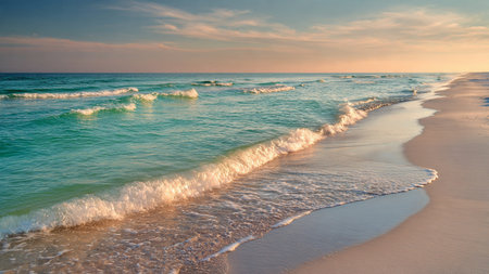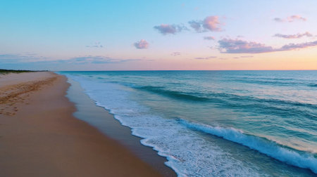 The image captures a serene beach scene with the ocean's waves gently lapping at the shore. The sky is clear with a soft gradient of colors as the sun sets or rises, casting a warm glow over the water. The beach is sandy with a gradual slope into the ocean. The waves are small and rhythmic, creating a calming atmosphere. The overall scene is peaceful and inviting, perfect for relaxation and enjoying the natural beauty of the coastline.