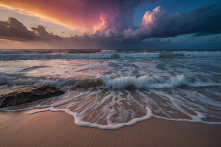 AI Generated. Dramatic sunset with vibrant colors over a turbulent ocean beach