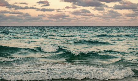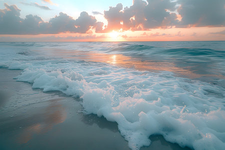 Beautiful sunset over calm ocean waves with soft clouds in the background reflecting warm colors