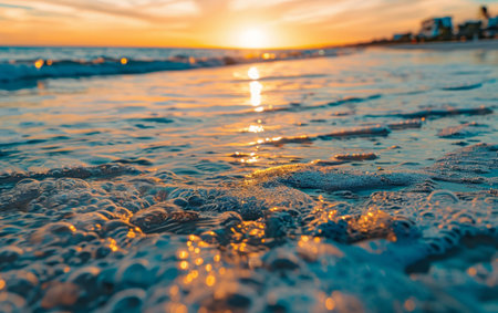 A stunning view of tranquil ocean waves reflecting a golden sunset, creating a serene atmosphere. The beautiful scenery captures the beauty of nature and peace.