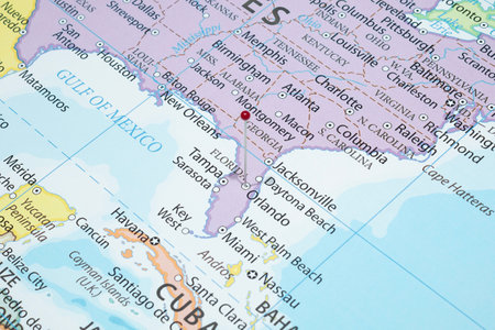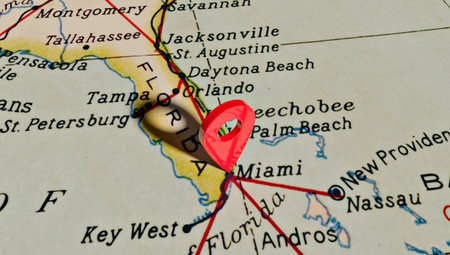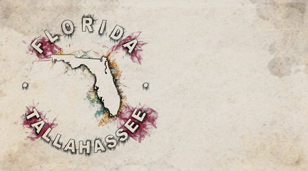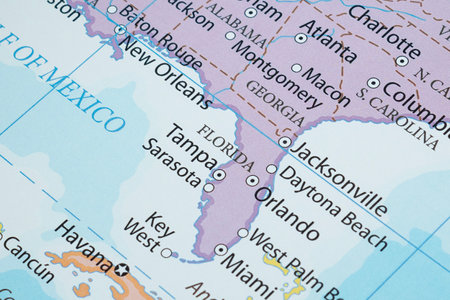 Macro photography of Florida state of United States of america political map with most important cities and borders