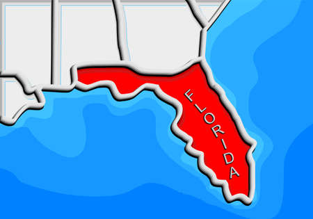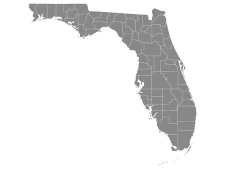 A grayscale map of Florida with a hanging Florida flag on one side. Vector map for many types of news. Vector illustration.