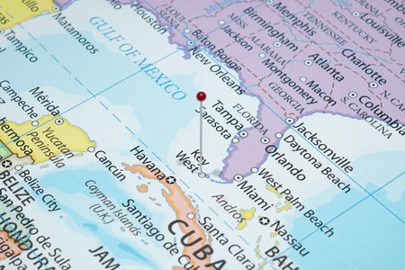 Close up to a Key West city with a red pin needle into United States of America country political map