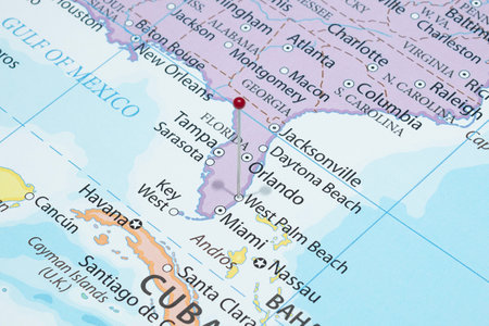 Close up to an Orlando city with a red pin needle into United States of America country political map