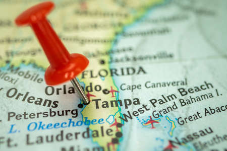 Location Tampa city in Florida, map with red push pin pointing close up, USA, United States of America