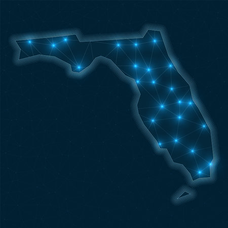 Florida network map. Abstract geometric map of the us state. Digital connections and telecommunication design. Glowing internet network. Classy vector illustration.