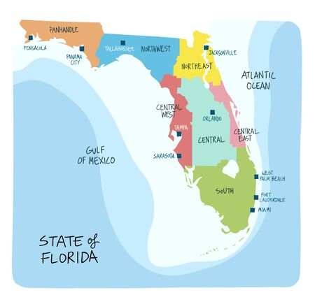 Hand Drawn map of the state of Florida with regions counties and main cities. Colorful sketch style