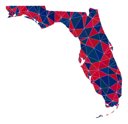 Vector triangle mosaic map of Florida State in American flag colors, blue and red. Geographic collage in blue and red color tones. Abstract collage of map of Florida State organized of triangle parts.