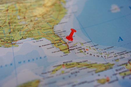 Close up to a West Palm Beach city with a red pin needle into United States of America country political map