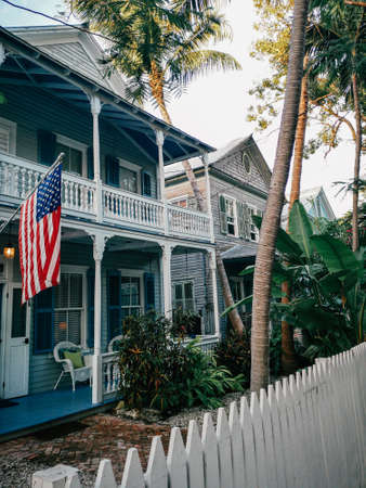 Old historic white building house with American flag on facade in Key West town city in Florida USA. White wooden fence palisade around the living place space.