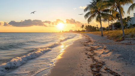A breathtaking sunrise over Miami Beach, Florida, with palm trees silhouetted against a vibrant sky.