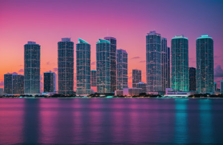 Miami city skyline at dusk with urban skyscrapers over sea.