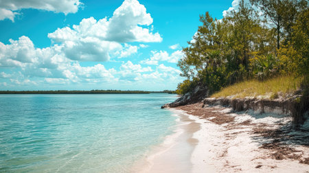 A tranquil beach scene featuring turquoise waters gently lapping against a sandy shoreline, framed by lush greenery and a bright blue sky, perfect for daydreaming and relaxation.