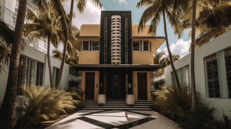 A beautifully preserved Art Deco hotel stands in Miami Beach, adorned with pastel colors and flanked by vibrant palm trees under a sunny sky, radiating a relaxed coastal vibe.