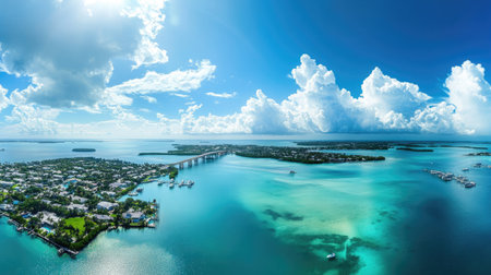 A panoramic view of the Florida Keys with turquoise waters and bridges. No people, copy space.