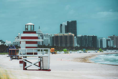 Miami South Beach skyline. Lifeguard tower in colorful Art Deco style and Atlantic Ocean at sunshine. Lifeguard Post on Miami Beach.