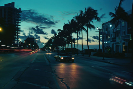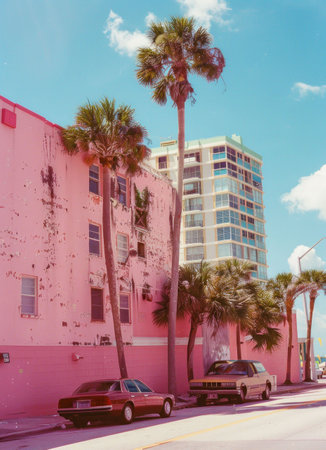 Bright sunlight illuminates the street in Miami Beach, where palm trees softly sway beside parked cars, showcasing a vintage hotel that adds to the charming coastal atmosphere.