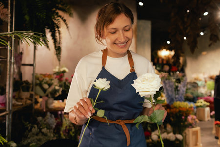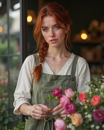 A young woman arranges fresh flowers in a charming florist shop during the afternoon