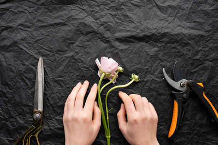 Girl florist lays out a flower tulip. Scissors and a knife.
